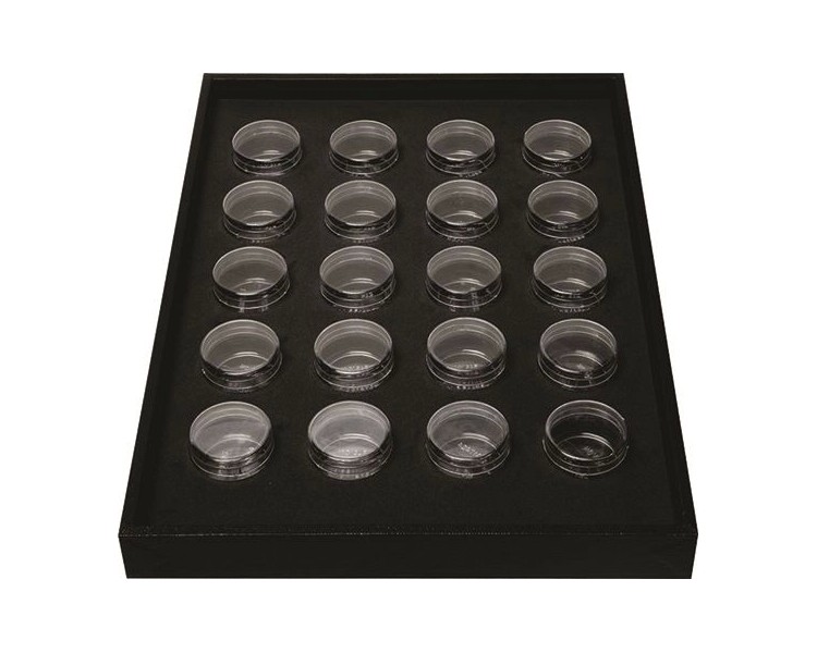 Display per accessori (minuteria) con scompartimenti in plastica richiudibili. Venduto vuoto. Misura: 355mm x 250mm x h 30mm Scompartimenti: diametro 40mm x h 25mm
